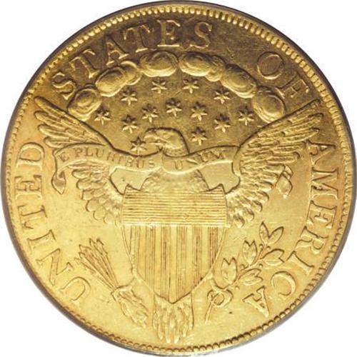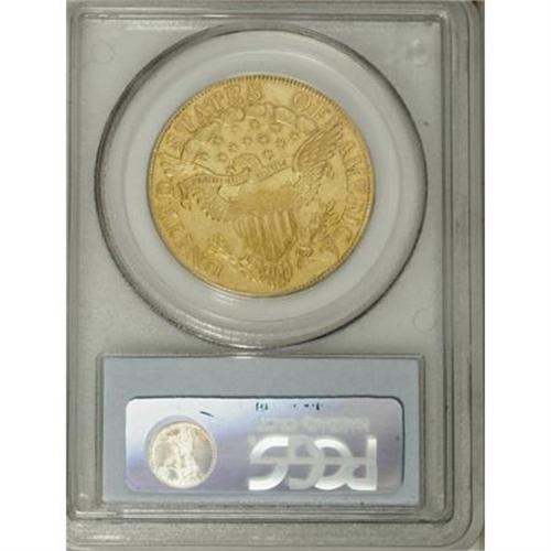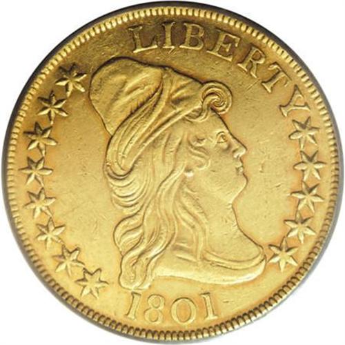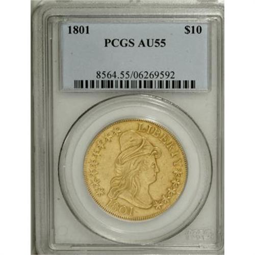 <B>1801 $10 AU55 PCGS.</B></I> Breen-6843, Taraszka-25, BD-2, R.2. This plentiful variety is quickly identified by the spacing of the stars on the left with star 1 distant from the hair curl and star 8 close to the cap. This is an especially well struck example that shows even, strong definition on Liberty's hair curls as well as the eagle's plumage. The surfaces are bright yellow-gold with an accent of reddish patina around the margins. There are no mentionable abrasions on either side of this lovely, high grade, early gold type coin. The obverse is lightly clashed and the reverse is perfect.<BR><BR><B>Coin Engraver:</B> Robert Scot<BR><BR><b>Shipping:</b> Coins & Currency (<a target="_blank" href="http://www.heritageauctions.com/common/shipping.php">view shipping information</a>\)