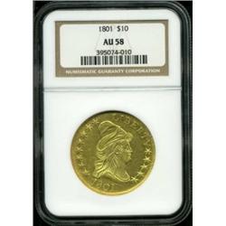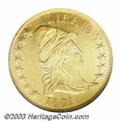 <table><tr><td><TABLE cellSpacing=0 cellPadding=0 width="100%" bgColor=#000000 border=0><TBODY> <TR><TD width="100%"><TABLE cellSpacing=1 cellPadding=3 width="100%" border=0><TBODY><TR><TD width="100%" bgColor=#79735c><FONT face=arial color=#ffffff size=3><B>Description</B> </FONT></TD></TR><TR><TD width="100%" bgColor=#ffffff><FONT face=arial size=2><B>1801 $10 AU58 NGC.</B></I> B. 2-B, Taraszka-25, R.3. A boldly struck Eagle that has exquisite details on Liberty's hair tresses and on the eagle's plumage. Only a trace of friction on Liberty's shoulder prevents a higher grade. The remaining luster is extensive and rather prooflike, and the only abrasion remotely worthy of mention is a wispy pinscratch that separates STATES and OF. The obverse has a couple of inconspicuous adjustment marks, although these do not affect the imposing eye appeal. The left obverse field has a tiny planchet flaw, as made. A lovely early Eagle that will be a splendid addition to an advanced gold type set. </FONT></TD></TR></TBODY></TABLE></TD></TR></TBODY></TABLE><BR><A name=PricesRealized></A><TABLE cellSpacing=0 cellPadding=0 width="100%" bgColor=#000000 border=0><TBODY><TR><TD width="100%"><TABLE cellSpacing=1 cellPadding=3 width="100%" border=0><TBODY><TR><TD width="100%" bgColor=#79735c><A name=PR><FONT face=arial color=#ffffff size=3><B>Previous Prices from Heritage Auctions</B> </FONT></A></TD></TR><TR><TD bgColor=#f6f6ed><TABLE cellSpacing=0 cellPadding=0 width="100%" border=1><TBODY><TR><TD align=middle width="33%"><B>Date</B></TD><TD align=middle width="33%"><B>Service</B></TD><TD align=middle width="33%"><B>Price</B></TD></TR><TR bgColor=whitesmoke><TD width="33%"><B>01/07/1998</B></TD><TD width="33%">NGC</TD><TD width="33%">$6,050.00</TD></TR><TR bgColor=whitesmoke><TD width="33%"><B>06/01/2000</B></TD><TD width="33%">NGC</TD><TD width="33%">$7,360.00</TD></TR><TR bgColor=whitesmoke><TD width="33%"><B>01/01/1990</B></TD><TD width="33%">PCGS</TD><TD width="33%">$5,280.00</TD></TR><TR bgColor=whitesmoke><TD width="33%"><B>05/01/1999</B></TD><TD width="33%">NGC</TD><TD width="33%">$7,475.00</TD></TR><TR bgColor=whitesmoke><TD width="33%"><B>10/01/1999</B></TD><TD width="33%">PCGS</TD><TD width="33%">$8,970.00</TD></TR></TBODY></TABLE></TD></TR><TR><TD bgColor=#ffffff><FONT face=arial size=1 ?>PLEASE NOTE: All prices realized reflect the final hammer price PLUS the buyer's premium in auctions that charge a buyer's premium. Each item has a notation at the top of the listing indicating whether that lot included a buyer's premium. Example: A item that sells with a final hammer price of $100 and a 20% buyer's premium will display with a price realized of $120. All information listed is intended to be as accurate as possible, but errors are possible. Please use this guide carefully and inform us of any inaccuracies. </FONT></TD></TR></TBODY></TABLE></TD></TR></TBODY></TABLE><BR><TABLE cellSpacing=0 cellPadding=0 width="100%" bgColor=#000000 border=0><TBODY><TR><TD width="100%"><TABLE cellSpacing=1 cellPadding=3 width="100%" border=0><TBODY><TR><TD width="100%" bgColor=#79735c colSpan=6><FONT face=arial color=#ffffff size=3><B>Price Guide*</B> </FONT></TD></TR><TR bgColor=#f6f6ed><TD align=middle><B>Grade</B> </TD><TD align=middle><B>Coin World<BR>(Trends)</B> </TD><TD align=middle><B>Numismedia<BR>Retail</B> </TD><TD align=middle><B>Numismedia<BR>Wholesale</B> </TD><TD align=middle><B>Coin<BR>Universe</B> </TD><TD align=middle><B>Heritage<BR>Value Index</B> </TD></TR><TR bgColor=#ffffff><TD align=middle>55</TD><TD align=right>$13,000.00</TD><TD align=right>---</TD><TD align=right>$6,875.00</TD><TD align=right>$12,500.00</TD><TD align=right>$8,700.00</TD></TR><TR style="FONT-WEIGHT: bold" bgColor=#cccfdd><TD align=middle>58</TD><TD align=right>$15,000.00</TD><TD align=right>---</TD><TD align=right>$7,950.00</TD><TD align=right>$11,750.00</TD><TD align=right>$9,126.25</TD></TR><TR bgColor=#ffffff><TD align=middle>60</TD><TD align=right>$18,000.00</TD><TD align=right>---</TD><TD align=right>$9,350.00</TD><TD align=right>$13,500.00</TD><TD align=right>$10,512.50</TD></TR><TR bgColor=#ffffff><TD colSpan=6><FONT size=1>*All information listed is intended to be as accurate as possible, but errors are possible. No item may be returned or refused based on this information which is provided as a service to our customers. You should contact each pricing source directly to determine the accuracy of this information. </FONT></TD></TR></TBODY></TABLE></TD></TR></TBODY></TABLE><BR><TABLE cellSpacing=0 cellPadding=0 width="100%" bgColor=#000000 border=0><TBODY><TR><TD width="100%"><TABLE cellSpacing=1 cellPadding=3 width="100%" border=0><TBODY><TR><TD width="100%" bgColor=#79735c><FONT face=arial color=#ffffff size=3><B>Population Guide</B> </FONT></TD></TR><TR bgColor=#ffffff><TD align=middle><!-- Begin Output of Population Grid--><TABLE cellSpacing=0 cellPadding=0 width="100%" border=0><TBODY><TR><TD vAlign=center><TABLE cellSpacing=0 width="100%" border=1 cellsadding="3"><TBODY><TR><TD vAlign=center><TABLE cellSpacing=0 cellPadding=3 width="100%" border=1><TBODY><TR><TD vAlign=center align=middle bgColor=#f0f1e8 colSpan=2 <CENTER><FONT face=Arial size=2><B>PCGS Pop </B></FONT><CENTER></CENTER></TD><TD vAlign=center align=middle bgColor=#f0f1e8 colSpan=2><CENTER><FONT face=Arial size=2><B>NGC Pop</B></CENTER></FONT></TD></TR><TR><TD vAlign=center><FONT face=Arial size=2>(58)</FONT> </TD><TD vAlign=center align=right><FONT face=Arial size=2>50</FONT> </TD><TD vAlign=center><FONT face=Arial size=2>(58)</FONT> </TD><TD vAlign=center align=right><FONT face=Arial size=2>69</FONT> </TD></TR><TR><TD vAlign=center><FONT face=Arial size=2>(>58)</FONT> </TD><TD vAlign=center align=right><FONT face=Arial size=2>178</FONT> </TD><TD vAlign=center><FONT face=Arial size=2>(>58)</FONT> </TD><TD vAlign=center align=right><FONT face=Arial size=2>153</FONT> </TD></TR></TBODY></TABLE></TD></TR></TBODY></TABLE></TD></TR></TBODY></TABLE><!-- E