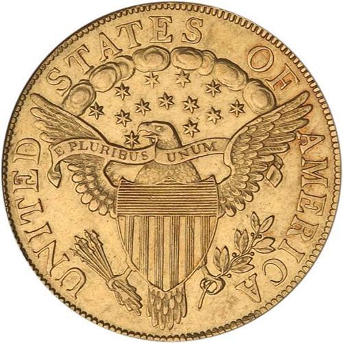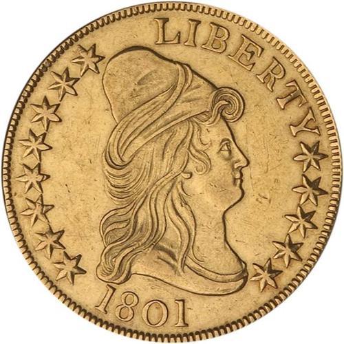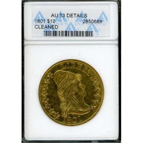 <b>1801 $10 Capped Bust. ANACS graded Details of AU53 Cleaned.</b> Cleaned, with resulting shininess throughout both sides. Bold detail a-plenty, however, as seen in the sharp stars and hair, the details in the eagle with its bold shield <b>(PCGS # 9564)</b>