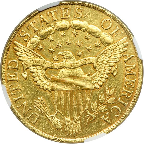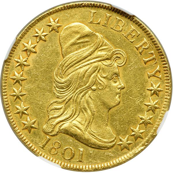 1801 $10 Capped Bust. . BD-2, Breen-6843, Star near cap. NGC graded AU-55. Some marks and ticks about the rims and in the fields. Untoned with ample luster present around the stars and legends. There is also a great deal of original mint frostiness displayed within Liberty's hair and cap, and throughout the eagle. Surfaces somewhat rough, though all in all a respectable example of this early Capped Bust Eagle design.