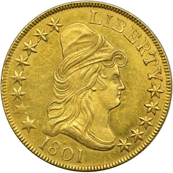 1801 $10 Capped Bust. . BD-2, T-25, Breen-6843. PCGS graded AU-58+. Well struck, except for stars 1 thru 3, with wonderful lustrous surfaces which are slightly prooflike and all, delicately toned. Only 44,344 struck. Two 1801-dated varieties are known through combination of two obverse and two reverse dies. T-25 is the single most common early ten-dollar gold coin minted from 1795 to 1804, with literally dozens of high quality specimens known today, accounting for their popularity in United States Gold Type Sets and other numismatic situations where a single attractive specimen is all that a collector requires. And attractive this coin is, still lustrous and radiant with largely mellow to warm greenish golden highlights on both sides. All but fully struck, with just a insubstantial touch of weakness at the lowest feathers on the arrows that are being grasped by the eagle. Pop 1 (note the new plus grade) (PCGS # 8564) .