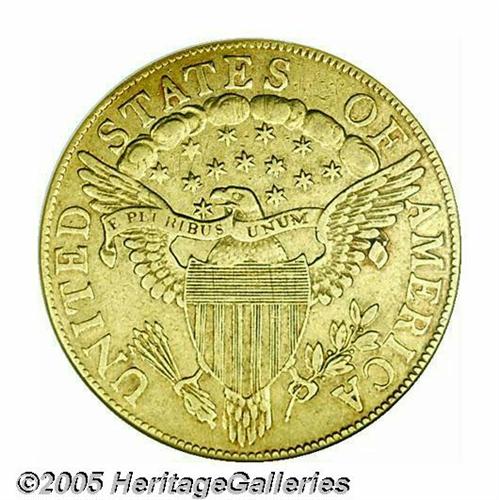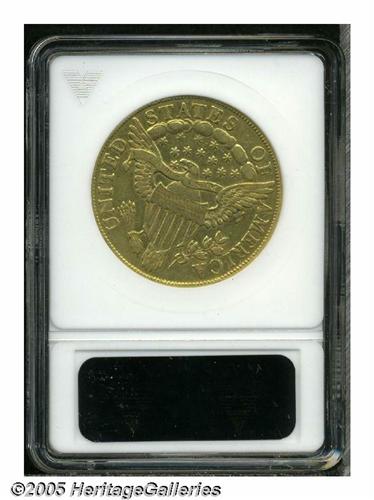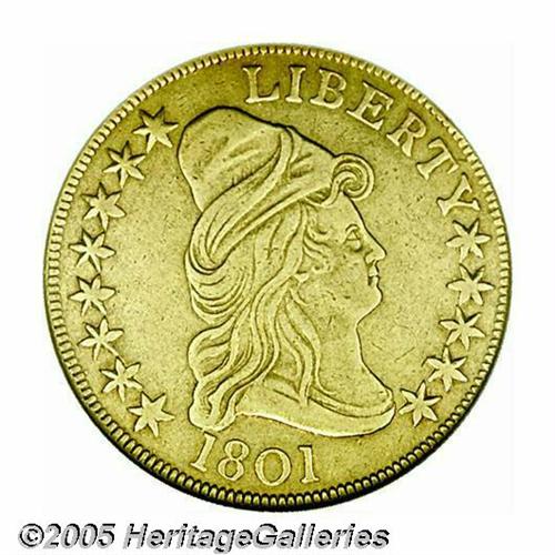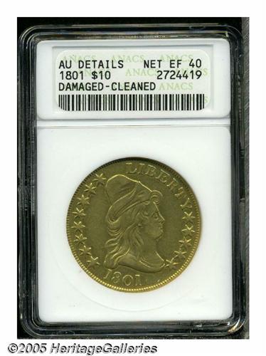 <B>1801<$10>--Damaged, Cleaned--ANACS. AU Details, Net XF40.</B></I> Breen-6843, B. 2-B, Taraszka-25, R.3. Clash marks from the shield within Liberty's cap identifies the die marriage. A hairlined tan-gold piece with moderate highpoint wear and notable glimpses of luster within the eagle's wings. A minor rim ding at 1:30 o'clock is of no importance, the 'damage' is not readily evident.<BR><I>From the Dr. Kurt Peters Collection.</B></I> From the Dr. Kurt Peters Collection.