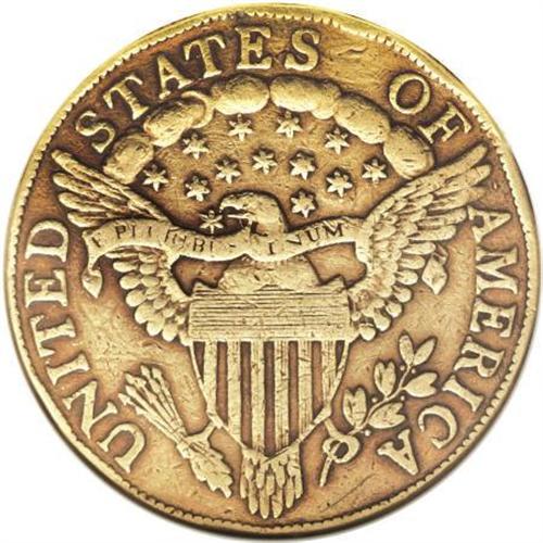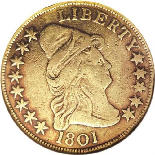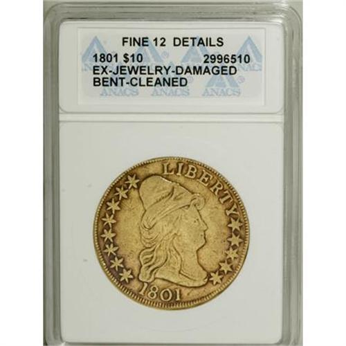 <B>1801 $10 --Ex-Jewelry, Damaged, Bent, Cleaned--ANACS. Fine 12 Details.</B></I> Breen-6843, Taraszka-25, BD-2, R.2. The edges are lightly bruised throughout, a pinscratch wanders above the date, the borders are iodine-red, and the slightly wavy surfaces are pockmarked from its former duty as jewelry. Nonetheless, a collectible example of this normally costly large early gold type.<BR><BR><B>Coin Engraver:</B> Robert Scot<BR><BR><b>Shipping:</b> Coins & Currency (<a target="_blank" href="http://www.heritageauctions.com/common/shipping.php">view shipping information</a>\)