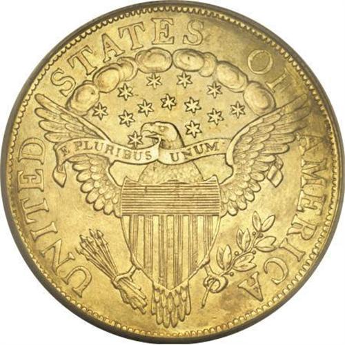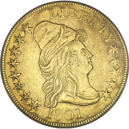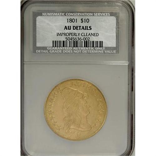 <B>1801 $10 --Improperly Cleaned--NCS. AU Details.</B></I> Breen-6843, Taraszka-25, BD-2, R.2. Both sides are cloudy from faint hairlines, but this green-gold Heraldic Eagle ten has pleasing detail and displays noticeable remaining luster. Well struck aside from the right-side obverse stars.<BR><BR><B>Coin Engraver:</B> Robert Scot<BR><BR><b>Shipping:</b> Coins & Currency (<a target="_blank" href="http://www.heritageauctions.com/common/shipping.php">view shipping information</a>)