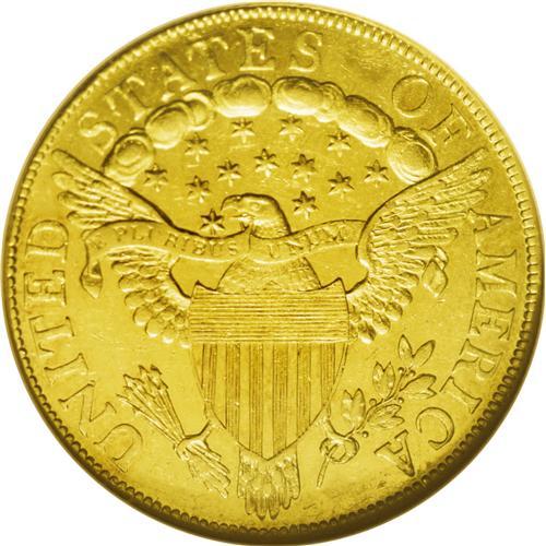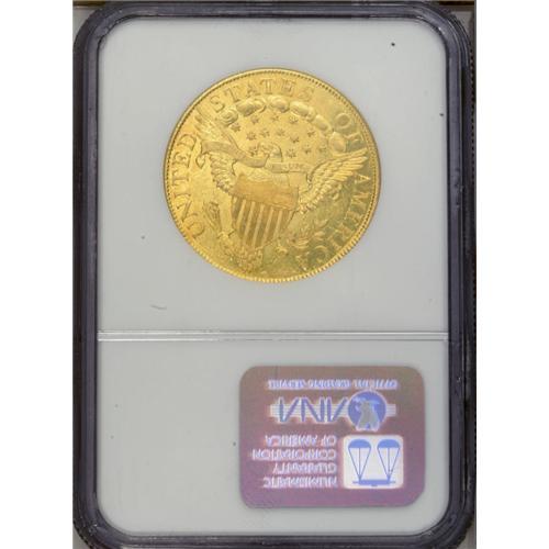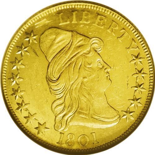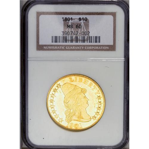 <B>1801<$10> MS60 NGC.</B></I> Breen-6843, B. 2-B, Taraszka-25, R.3. The variety is confirmed by the first 1 in the date practically touching the curl, star 1 being high and presenting only one point to the curl, and a space between the clouds that is below the right serif of the E of STATES. Mint records report the mintage as 29,254 pieces in 16 different deliveries, to which must be added 15,000 coins struck in 1802 from 1801 dies.<BR> The specimen offered here displays bright, yellow-gold surfaces with prooflike luster in the protected areas of the obverse and most of the reverse field. The design elements are well centered on the planchet and sharply defined, except that a couple of the star centers are soft. Two abrasions are reported on the obverse: one near the center of Liberty's cap, the other under star 7. Pronounced scuffiness in the obverse fields serves to limit the assigned grade.