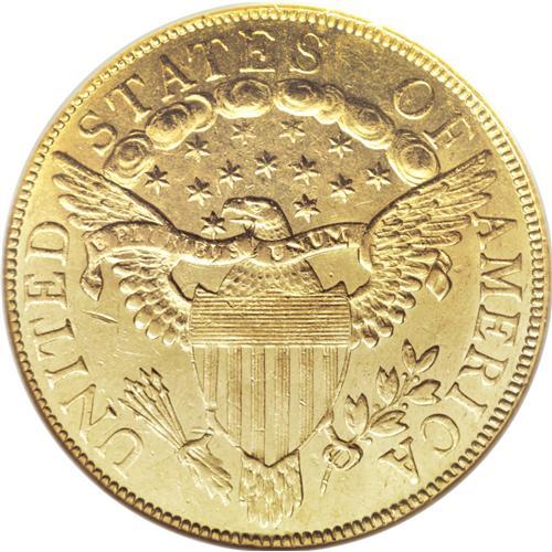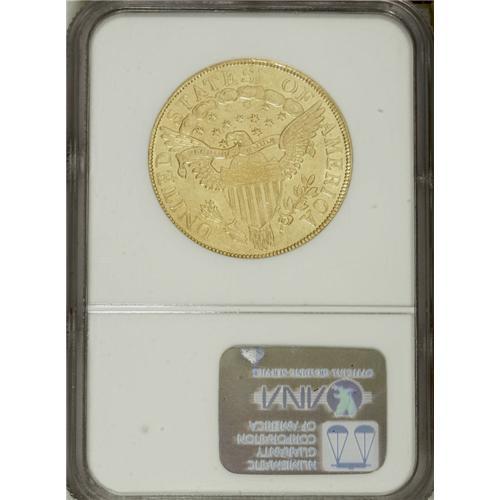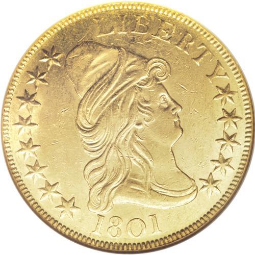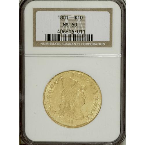 <B>1801 $10 MS60 NGC.</B></I> Breen-6843, B. 2-B, Taraszka-25, R.3. Among early tens, the 1801 has the highest mintage in the series and is surpassed in availability only by the 1799. This fully lustrous yellow-gold example is well detailed throughout and displays the often-seen "spines" in Liberty's cap. A number of scuffy abrasions across the obverse dilute the effectiveness of the luster. As is typical of these early eagles, the reverse is far less prone to surface marks. Ideal quality to represent the extremely popular Capped Bust, Heraldic Eagle type.<BR><BR><b>Shipping:</b> Coins & Currency (<a target="_blank" href="http://www.heritageauctions.com/common/shipping.php">view shipping information</a>)