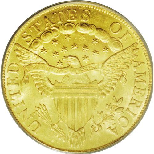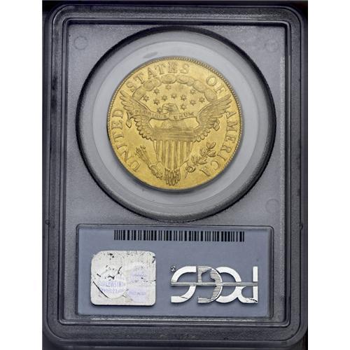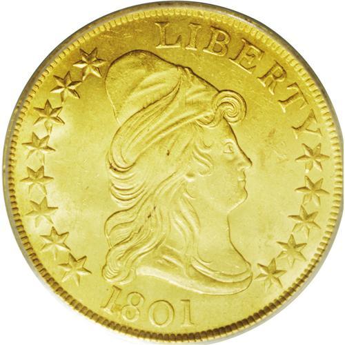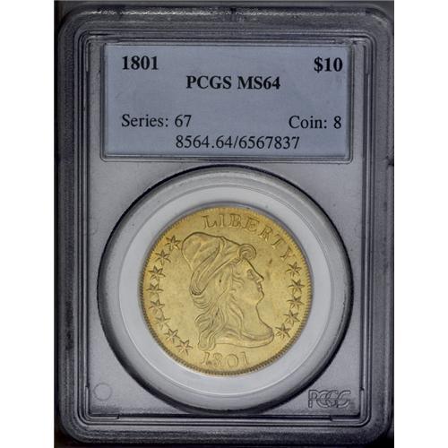 <B>1801<$10> MS64 PCGS.</B></I> Breen 2-B, Breen-6843, Taraszka-25, R.3. Two varieties exist for the eagles dated 1801. These were struck from different obverse and reverse dies, and a quick glance at either side will easily distinguish between them. These varieties are currently cataloged as Taraszka-24 and Taraszka-25. Taraszka-24 has star 1 closer to the hair curl than star 8 (to the cap), and it has a cloud space below the center of E in STATES. Taraszka-25 has star 8 closer than star 1, and it has a cloud space below the right edge of the E in STATES. The first variety is an important rarity in the early series of 10 dollar gold coinage, while the latter (which is offered here) is easily the most plentiful variety of any early eagle from 1795 to 1804, and one of just four varieties in the entire series to be given the R.3 rating. It is possible that this variety is actually a R.2 die marriage, and it is thus the perfect choice for type collectors. Numerous Mint State examples are available, including Choice specimens such as the coin offered here. It is intriguing that this plentiful variety is always found with perfect, undamaged dies, aside from a few spines in the Liberty cap that are the result of clash marks from the shield on the reverse.<BR> Original Mint records from this time period indicate that 44,344 eagles were coined in 1801, from a total mintage of 132,592 such coins during the 1795 to 1804 time frame. The 1801 total represents almost exactly one-third of the mintage for the entire series, but it is not necessarily an accurate reflection of those coins bearing the 1801 date. In the late 18th century and early 19th century, coinage dies were expensive to produce, due in part to the cost of materials, but mostly due to the laborious process of creating a new die. As a result, dies were used until they were no longer effective. Some dies cracked and broke <BR><BR><B>Importan