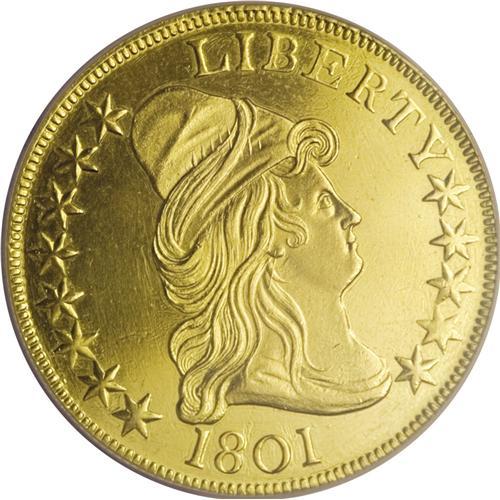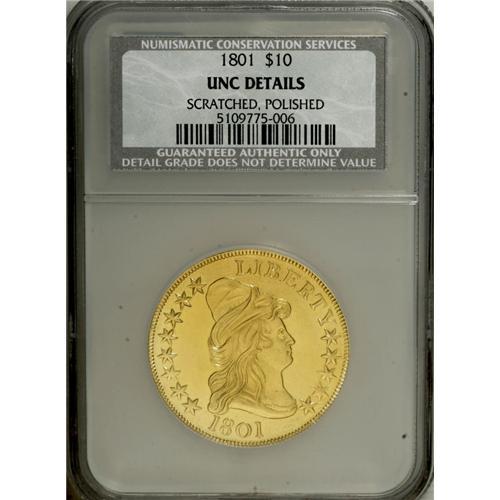 <B>1801 $10 --Scratched, Polished--NCS. Unc Details.</B></I> Breen-6843, Taraszka-25, BD-2, R.2. This piece has a sharp strike with clearly visible clash marks within Liberty's cap and elsewhere. Both sides have been extensively tooled, especially evident on the obverse. Both sides have also been polished, and this piece now has an unnatural bright green-gold appearance.<BR><BR><b>Shipping:</b> Coins & Currency (<a target="_blank" href="http://www.heritageauctions.com/common/shipping.php">view shipping information</a>)