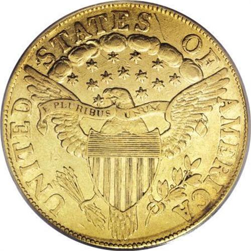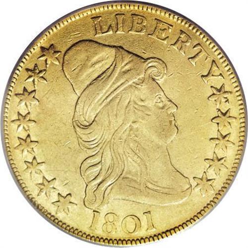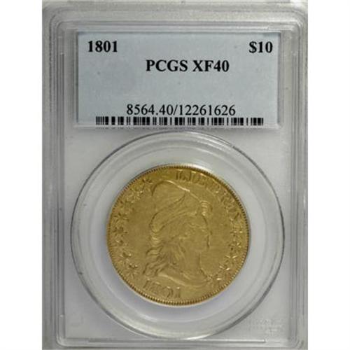 <B>1801 $10 XF40 PCGS.</B></I> Breen-6843, Taraszka-25, BD-2, R.2. Star 8 close to the cap; cloud space below right edge of E in STATES. The two varieties of 1801 are quickly distinguished by a glance at either star 1 or star 8 on the obverse. BD-1 is a much rarer variety, identified by star 1 nearly touching the hair curl and star 8 distant from the cap. BD-2 is the most common early eagle, with star 1 distant from the curl and star 8 close to the cap. The reverse die of this variety made its first appearance in 1801, and continued in use with an 1803 obverse die. This piece is an attractive greenish-gold representative with lightly abraded surfaces and moderate wear on the highpoints. Both sides retain some luster, and the overall appearance is pleasing to the eye. It is an excellent candidate for a type collection.<BR><BR><B>Coin Engraver:</B> Robert Scot<BR><BR><b>Shipping:</b> Coins & Currency (<a target="_blank" href="http://www.heritageauctions.com/common/shipping.php">view shipping information</a>)