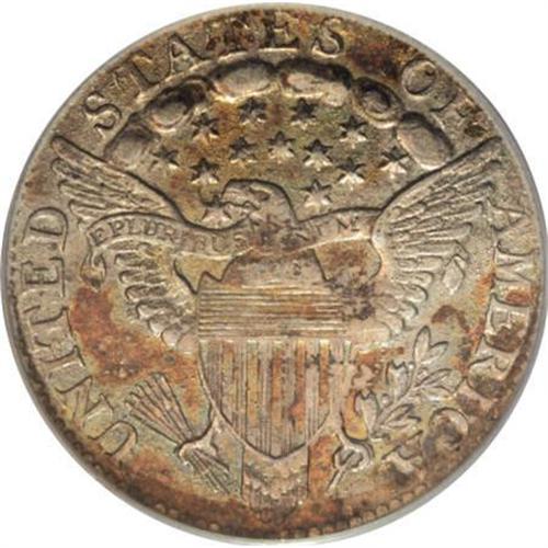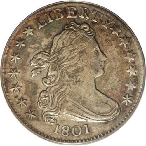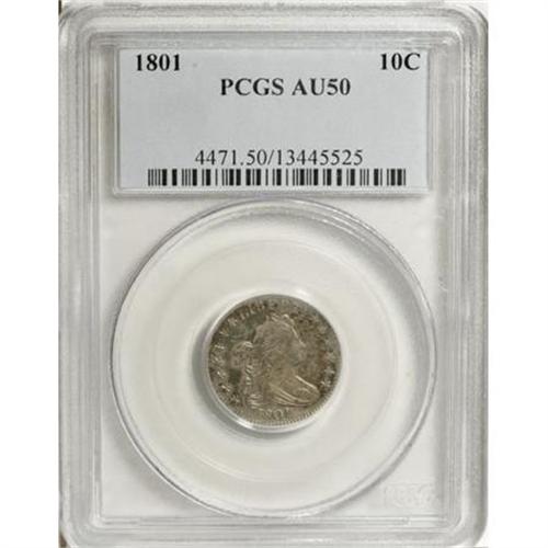 <B>1801 10C AU50 PCGS.</B></I> JR-1, R.4. Mottled orange-red, apple-green, and pearl-gray embrace this attractive representative. The eagle's breast feathers and the right shield border are incomplete, but the strike is generally crisp. Marks are nonexistent, and the eye appeal is undeniable. Struck from a rusted reverse die. Only two varieties are known for the 1801 dime. Both share the same obverse, which has a repunched R in LIBERTY. JR-1 is distinguished by the arrowhead beneath the U in UNITED, which extends past the U for the rare JR-2. Population: 3 in 50, 6 finer (7/07).<BR><BR><B>Coin Engraver:</B> Robert Scot<BR><BR><b>Shipping:</b> Coins & Currency (<a target="_blank" href="http://www.heritageauctions.com/common/shipping.php">view shipping information</a>)