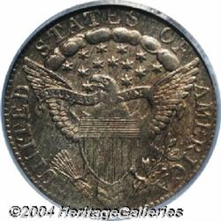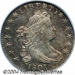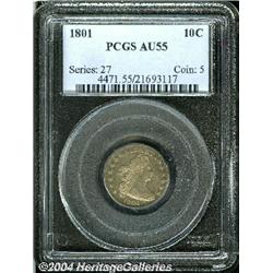 <B>1801<10C> AU55 PCGS.</B></I> JR-1, R.4. One of only two die marriages known for this challenging date. The R in LIBERTY is widely recut, and the reverse has numerous mint-made raised die lumps. Liberty's drapery exhibits slight wear, but this satiny apricot-gray piece is otherwise close to Mint State. Crisply struck except for the eagle's breast feathers and the upper right border of the shield. Surprisingly unabraded and worthy of a premium bid. Considerable time may elapse before another example of similar quality appears at auction. Population: 1 in 55, 1 finer (9/04). <BR><BR><B>Important notice:</B> Heritage usually auctions material at the rate of 200-250 lots per hour. On some occasions eBay Live bid software or the Internet may not be able to keep up with the pace of the auction. We recommend placing a realistic absentee bid now as insurance to avoid disappointment. Occasionally the auctioneer may eliminate or reject an eBay Live bid, and the auctioneer may also reopen a lot after the close of the eBay live bidding (usually because we missed an audience bid), and may reject your bid even if it shows you as the winning bidder. By bidding via eBay Live, you agree that Heritage may award the lot to another bidder at its sole discretion under the circumstances described above or any other reasonable circumstances. Since eBay bids are not shown to us until we open the lot on the floor, we treat those bids just like floor bids. In most cases the floor responds before the eBay bid is presented to us, due to Internet lag time, so for consistency we have made it a policy that floor bids are always considered first over tie eBay live bids. Also please note that all Heritage lots purchased through eBay Live carry a 20% Buyer's Premium. Please make sure you read the Terms and Conditions before you bid.