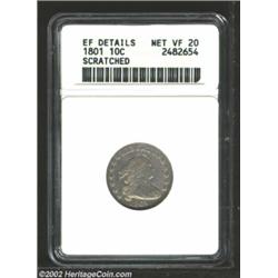 1801 10C--Scratched--ANACS. XF Details, Net VF20. JR-1, R.4. Struck from the leftover, rusted reverse die of the 1800 JR-2 Dime, this coin display the diagnostic rust pits (as struck) around the eagle. There are also some pock mocks on the reverse, as well as pinscratches over the central obverse. Mostly silver-gray in color with brighter apricot tinged undertones evident at direct angles. Important notice: We expect to be auctioning lots at the rate of 200-250 per hour. Sometimes eBay Premier live bid software cannot keep up with that pace, so we strongly recommend that you place a realistic proxy bid now as insurance to avoid disappointment. Also please note that all Heritage/CAA lots purchased through eBay Premier carry a 20% Buyer's Premium. Please make sure you read the Terms and Conditions.