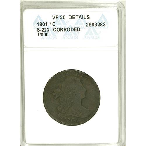 <B>1801 1C 1/000--Corroded--ANACS. VF20 Details.</B></I> S-223. NGC Census: (0/0). PCGS Population (0/6). Numismedia Wsl. Price for NGC/PCGS coin in VF20: $375. (#1464)<BR><BR><b>Shipping:</b> Coins & Currency (<a target="_blank" href="http://www.heritageauctions.com/common/shipping.php">view shipping information</a>)