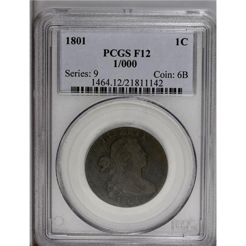 <B>1801<1C> 1/000 Fine 12 PCGS.</B></I> S-220, B-12, R.3. The 1/000 is one of the more amusing varieties in the series, given the mathematical impossibility of the fraction. Moderately worn with medium brown surfaces. A die break appears beneath the date. EAC 8.