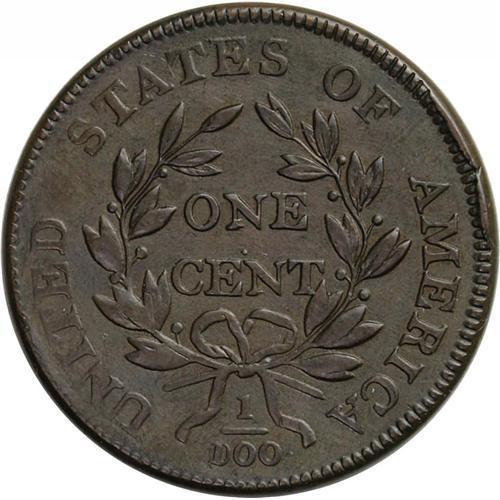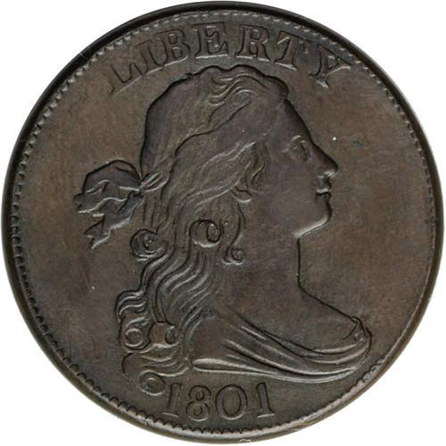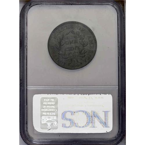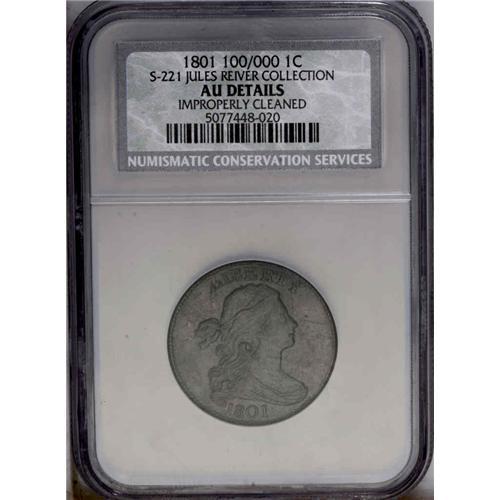 <B>1801<1C> 100/000. S-221, B-5, Low R.2--Improperly Cleaned--NCS. AU Details. VF20 EAC.</B></I> Die State IV. This coin has chestnut-brown surfaces that when rotated under a light emit an unnatural, light copper-red luster. Despite this evidence of cleaning, though, this is a lovely and appealing coin, well detailed, well struck, and virtually mark-free, even when perused under magnification. On the obverse the long, straight die scratch running through the hair to the ribbon is clear. There is a razor-sharp delineation of Liberty's hair from the forehead. Even though light evidence of rub shows on the hair's highest points, the small forelocks on the cheek and neck exhibit unusually fine detail. The hair strands show bold separation throughout. The drapery is sculpted and robust, with no weak spots at the bust end. On the reverse some of the lower leaf pairs are not fully separated, but most of the upper leaves show their central veins. The correction fraction is boldly impressed. The coin is well centered, with all obverse dentilation showing. The reverse dentilation is weak only above IT. This coin is apparently from early in Die State III, for it exhibits no obvious evidence of obverse clash marks, but there are two narrow rim breaks, one above the space to the right of OF, a second above AM, with dentils present in between. A delightful coin despite the "improvement" attempt.<BR><I> Ex: Olson; George Ramont (1/3/1969).</B></I> Envelope Included.