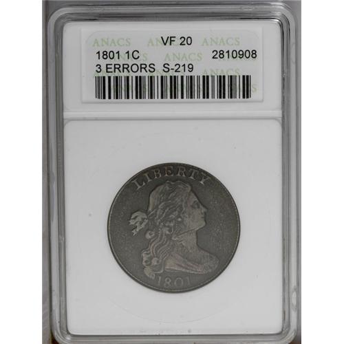 <B>1801 1C 3 Errors VF20 ANACS.</B></I> S-219, Low R.2. Dark steel and olive-brown surfaces with light porosity on both sides. An old, shallow scratch crosses Liberty's neck. This is a pleasing example despite the minor imperfections. EAC 8.