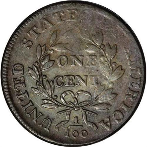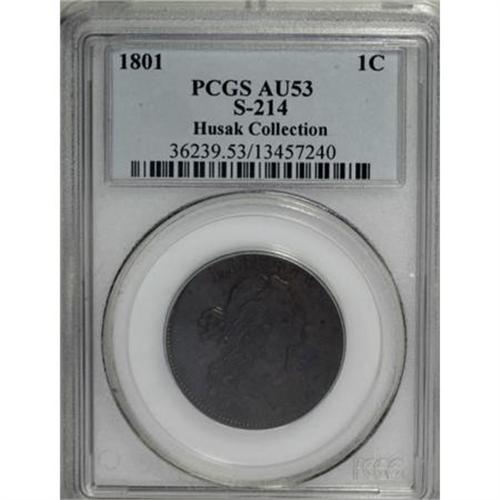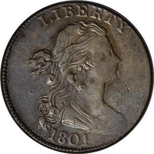 <B>1801 1C AU53 PCGS. S-214, B-2, R.3.</B></I> <B>Bland XF40; tied for CC-7. Noyes VF35; CC-5. Photo #39167. Our EAC Grade XF40.<BR><BR>Equivalents. </B></I>McGirk 3C2; Newcomb 2; EAC 2; <I>Encyclopedia </B></I>1738; PCGS #1458.<BR><B><BR>Variety. </B></I>18 and 01 distant with 80 close. Numerator nearly rests on high, thin fraction bar. The obverse appears on S-214. The reverse appears on S-213, S-214, and S-215.<BR><B><BR>Surfaces.</B></I> Olive and steel surfaces with splashes of chestnut, and considerable maroon patina at the right side of the reverse. The surfaces are noticeably abraded, especially at the bust. As usual, the drapery and upper right reverse lack detail. Breen writes in his <I>Large Cent Encyclopedia:</B></I> "Often weak on the profile and end of drapery, lower right obverse dentils, some leaves on the right branch, S OF, and upper right border, reflecting axial misalignment of State III."<BR><BR><B>Die State III. </B></I>The die state identification is based on Breen's comment about strike, although there is no evidence of the obverse rim break over RTY, due to poor centering. <BR><BR><B>Census. </B></I>The top three representatives are Mint State, followed by two XF45's and three XF40's in Bland's Census. Although Noyes grades this piece slightly lower than Bland, he places it higher in his Census.<BR><BR><B>Commentary. </B></I>Newcomb did not record the final die state in his reference, perhaps for the same reason that the rim break Breen describes is not visible on this piece.<BR><BR><B>Provenance. </B></I><I>Bowers and Merena (9/1996), lot 32; Don Valenziano, Jr.; McCawley and Grellman (1/1997), lot 242; Thomas D. Reynolds.</B></I><BR><BR><B>Personality. Don Valenziano, Jr.</B></I> was born on April 27, 1952, in Omaha, Nebraska. A collector of half cents, he began a full time coin career in 1986, specializing in copper coinage. Valenziano has helped in the management of several Early American Coppers annual conventions.<BR><BR><b>Shipping:</b> Coins & Currency (<a target="_blank" href="http://www.heritageauctions.com/common/shipping.php">view shipping information</a>)