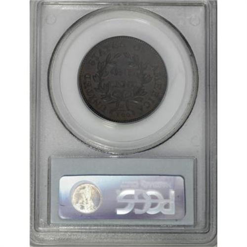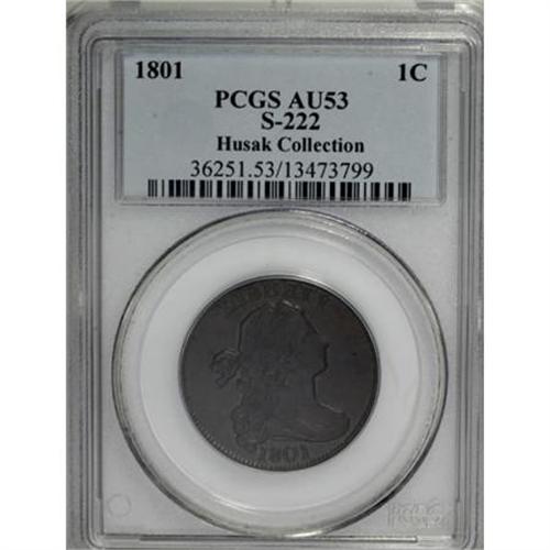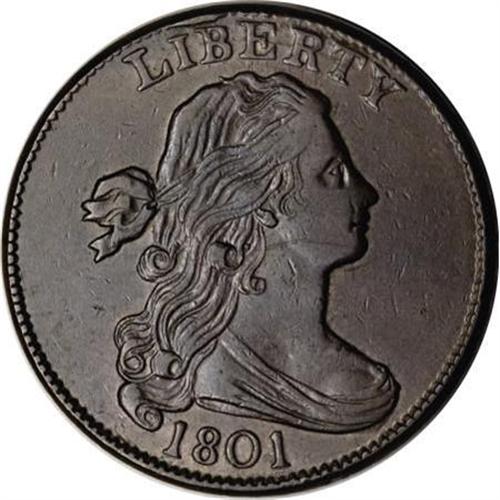 <B>1801 1C AU53 PCGS. S-222, B-16, R.1.</B></I> <B>Bland XF45; tied for CC-6. Noyes XF45; CC-4. Photo #29665. Our EAC Grade XF45.<BR><BR>Equivalents. </B></I>Proskey 7; Doughty 162; McGirk 3D; Newcomb 10; EAC 15; <I>Encyclopedia </B></I>1741; PCGS #1458.<BR><B><BR>Variety. </B></I>Blunt 1s, top of date nearly straight across. Point of high leaf between S and O. The obverse appears on S-222, S-223, and NC-3. The reverse appears on S-222 and NC-4.<BR><B><BR>Surfaces.</B></I> Choice olive surfaces with a fine scratch on Liberty's jaw, and a small mark on the neck; otherwise pristine. Typically weak details in the wreath, but with a full and complete border.<BR><BR><B>Die State III. </B></I>The obverse has a thin rim break over IB that protrudes into the field but does not touch the tops of either letter.<BR><BR><B>Census. </B></I>Here is another early cent variety that is considered common, when all grades are considered, but a rarity in top grades. Less than six AU or Mint State pieces are known. Bland grades the top nine coins 61-60-60-55-50-45 (4), and Noyes grades them 62-55-50-45-40 (5).<BR><BR><B>Provenance. </B></I><I>1947 ANA (Numismatic Gallery, 8/1947), lot 860, $30; Willard C. Blaisdell; Lillian S. Willins; Douglas Bird; Bob Everett (1993); Alan Kollar; Superior (5/2005), lot 1023, $6,325.</B></I><BR><BR><B>Personality. Robert W. Everett</B></I> was best described as a "gentle giant." A coin dealer from Seattle, Washington, he died on August 7, 1997, at the age of 49 from the complications of acromegaly. He was a graduate of the University of Washington. Everett operated Classical American Coins, and he possessed a keen eye for quality. In the December 1997 issue of <I>The Numismatist</B></I>, it is noted: "Everett's numismatic customers soon became his friends. ... ‘Big Bob' will always be remembered as a person of the highest integrity."<BR><BR><b>Shipping:</b> Coins & Currency (<a target="_blank" href="http://www.heritageauctions.com/common/shipping.php">view shipping information</a>)