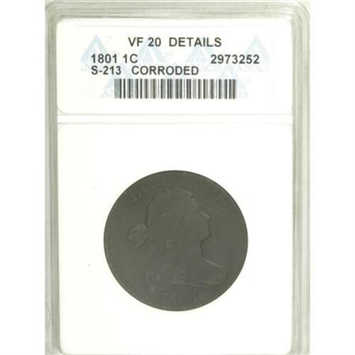<B>1801 1C --Corroded--ANACS. VF20 Details.</B></I> S-213. NGC Census: (5/39). PCGS Population (7/44). Mintage: 1,362,837. Numismedia Wsl. Price for NGC/PCGS coin in VF20: $333. (#1458)<BR><BR><b>Shipping:</b> Coins & Currency (<a target="_blank" href="http://www.heritageauctions.com/common/shipping.php">view shipping information</a>)