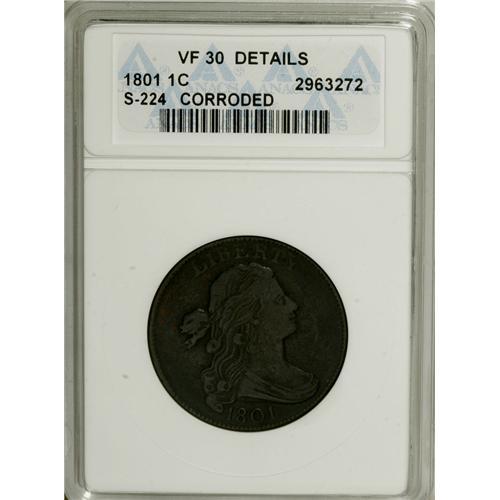<B>1801 1C --Corroded--ANACS. VF30 Details.</B></I> S-224. NGC Census: (21/44). PCGS Population (5/31). Mintage: 1,362,837. Numismedia Wsl. Price for NGC/PCGS coin in VF30: $470. (#1458)<BR><BR><b>Shipping:</b> Coins & Currency (<a target="_blank" href="http://www.heritageauctions.com/common/shipping.php">view shipping information</a>)