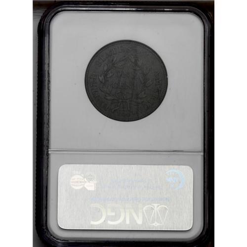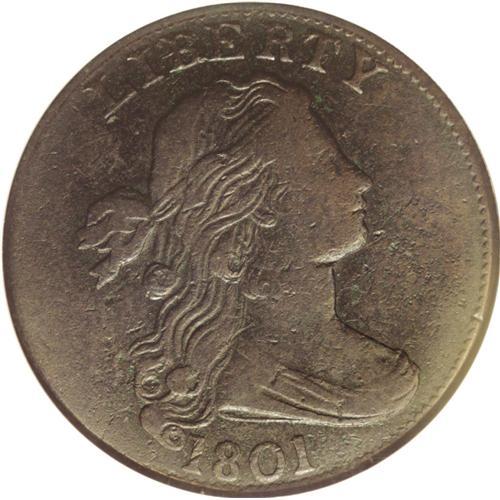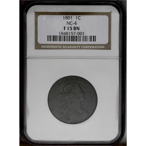 <B>1801<1C> Fine 15 NGC.</B></I> NC-4, R.7. <B>The Noyes Plate Coin.</B></I> Today, there are just eight known examples of this extremely rare and important early cent variety. Del Bland lists eight known examples in his Census, while Bill Noyes lists between six and eight examples, depending on the source consulted. The variety was unknown to Newcomb or his predecessors, and it was not known to Sheldon when he wrote <I>Early American Cents,</B></I> published in 1949. Nor was it listed in Sheldon's initial edition of <I>Penny Whimsy,</B></I> published in 1958, although it should have been. Dr. Sheldon personally cataloged the Charles Dupont large cents, sold by Stack's in 1954, which included an example of this variety. He had reservations about listing this as a new variety due to heavy burnishing of the discovery specimen. When Walter Breen located a second example in 1963, Sheldon finally agreed that the NC-4 is a legitimate variety.<BR> The present example is considered by most to be the finest known of the variety. It is graded VG10 by Bland as listed in <I>Walter Breen's Encyclopedia of Early United States Cents</B></I> and VG8 by Noyes in his references. In his reference, <I>United States Large Cents 1793-1814,</B></I> Noyes recorded a Census with the top six coins grading: VG8, VG8, G4, G4, G4, AG3. More recently, he has recorded the top six with grades of: VG8, VG7, G5, G4, G4, AG3. For comparison, Bland listed the top six pieces with grades of: VG10, VG8, G5, G5, G4, G4.<BR> The surfaces are dark steel-brown with some olive color and lighter brown on the devices. Numerous nicks range from microscopic to moderate in size, although only one at Liberty's throat is more noticeable than the others. The surfaces also have slight corrosion, yet all of these blemishes are consistent with the grade. In the 1991 EAC catalog, Noyes graded this coin as VG8, noting that it has the sharpness of a VF coin. Tod