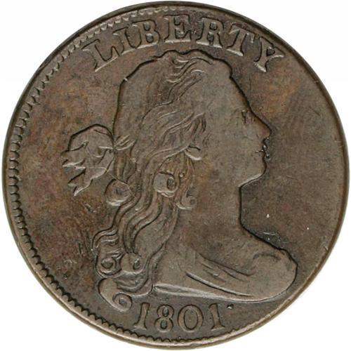 <B>1801<1C> S-222, B-16, High R.1. Fine 15 NGC and EAC.</B></I> Die State I. Faint clash marks show above ERTY from the reverse dentils, and perhaps below the chin from leaves on the reverse. There is no sign as yet of the rim break that would form in the next die state above IB. This glossy, pleasant coin is on a medium-brown, clean planchet, with a normal, grade-consistent number of marks revealed under a glass. The reverse die is slightly rotated.<BR><I> Ex: Dom Perri (11/24/1968).</B></I> Envelope Included.