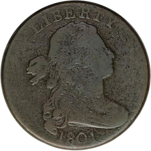 <B>1801<1C> S-214, B-2, High R.3--Environmental Damage--NCS. VG Details. VG7 EAC.</B></I> Olive, chestnut, and steel-brown color are smoothly blended together into a nice presentation. The surfaces have minor corrosion, especially on the obverse. Die state I or II; an early die state with slight weakness above RTY of LIBERTY, but not enough to suggest die failure in that area.<BR><I>Ex: George Ramont (3/29/1971).</B></I> Envelope Included.