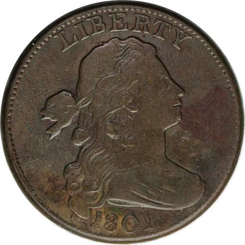 <B>1801<1C> S-224, B-13, R.1--Improperly Cleaned--NCS. VF Details. VG8 EAC.</B></I> The surfaces have tan, maroon, and darker olive color. An early die state. Envelope Included.