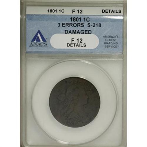 <B>1801 1C Three Errors--Damaged--ANACS. Fine 12 Details.</B></I> S-218, B-8, High R.5. The more elusive of two Three Errors die pairings for the year, with LIBERTY shifted to the right when compared to the more available S-219. The olive-brown obverse displays nicely, though the reverse shows fresh metal at a disturbance below the feet of the R in AMERICA. EAC 6.<BR><BR><b>Shipping:</b> Coins & Currency (<a target="_blank" href="http://www.heritageauctions.com/common/shipping.php">view shipping information</a>)
