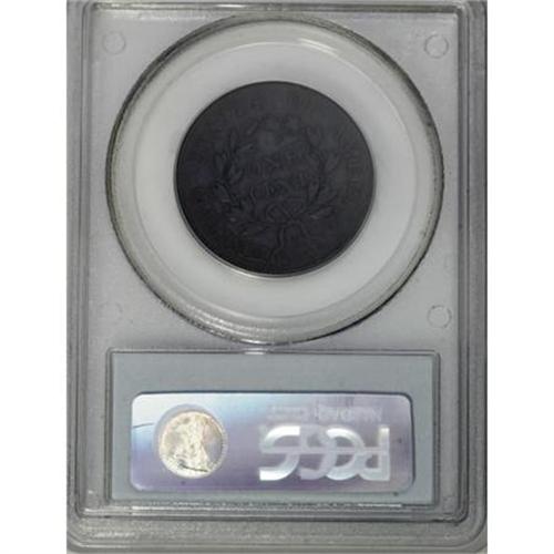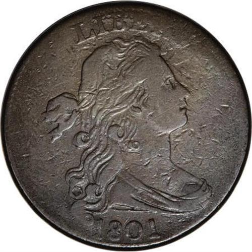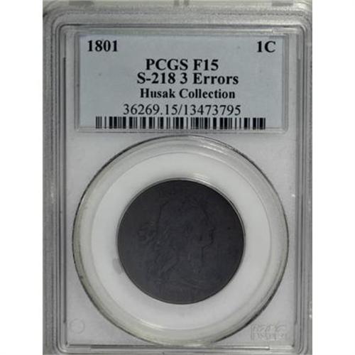 <B>1801 1C Three Errors. Fine 15 PCGS. S-218, B-8, High R.5.</B></I> <B>Bland Fine 12; CC-3. Noyes Fine 12; CC-4. Photo #21590. Our EAC Grade Fine 12.<BR><BR>Equivalents. </B></I>Newcomb 4; EAC 8; <I>Encyclopedia </B></I>1742; PCGS #1461.<BR><B><BR>Variety. </B></I>Curl point below I. Three Errors. The obverse appears on S-217 and S-218. The reverse appears on S-218 and S-219.<BR><B><BR>Surfaces.</B></I> Pleasing dark brown color with traces of deeper steel toning. The surfaces are moderately abraded as expected for the grade. A tiny planchet void is evident over the O in OF. The Husak coin has the finest surface quality of any S-218 available to collectors.<BR><B><BR>Die State II. </B></I>The obverse has a heavy die bulge over ERTY and another behind the lowest curl. Breen described State II as an extremely rare die state. Given the rarity of the variety, both die states could be called extremely rare.<BR><B><BR>Appearances. </B></I>The obverse and reverse are illustrated in Breen's <I>Large Cent Encyclopedia</B></I>.<BR><BR><B>Census. </B></I>The finest known example is a VF30 in the ANS Collection, followed by just two or three coins that grade Fine. Noyes records 28 different examples in his Census. Of those, two are labeled Average Plus, eight are called Average, 10 are called Average Minus, and eight are called Scudzy. This wonderful Census-level piece is one of the two Average Plus coins, and the other is in the ANS Collection.<BR><BR><B>Commentary. </B></I>An easy variety to attribute, with LIBERTY place far to the right, the point of curl below the I, rather than its usual location below the B. The reverse is the famous Three Errors reverse. The rarity and low overall Condition Census of S-218 makes this a worthwhile die marriage to hunt down unattributed.<BR><BR><B>Provenance. </B></I><I>James G. Macallister (1932); Dr. William H. Sheldon (8/1950); C. Douglas Smith (1971); Robinson S. Brown, Jr. (Superior, 9/1986), lot 321, $4,180; Jack H. Robinson (Superior, 1/1989), lot 461, $7,425; John R. Frankenfield (Superior, 2/2001), lot 490, $19,550.</B></I><BR><BR><B>Personality. </B></I>A resident of Philadelphia, <B>James G. Macallister</B></I> was born in 1892 and died on October 13, 1945. He was a professional numismatist who cataloged coins for Wayte Raymond and also did considerable private business, although he did not have a shop. Macallister had a special interest in Colonials and early coppers, handling many important large cents. He often exhibited rarities at ANA conventions. His advertisements to purchase coins stated that he was not a dealer and had nothing for sale.<BR><BR><b>Shipping:</b> Coins & Currency (<a target="_blank" href="http://www.heritageauctions.com/common/shipping.php">view shipping information</a>)