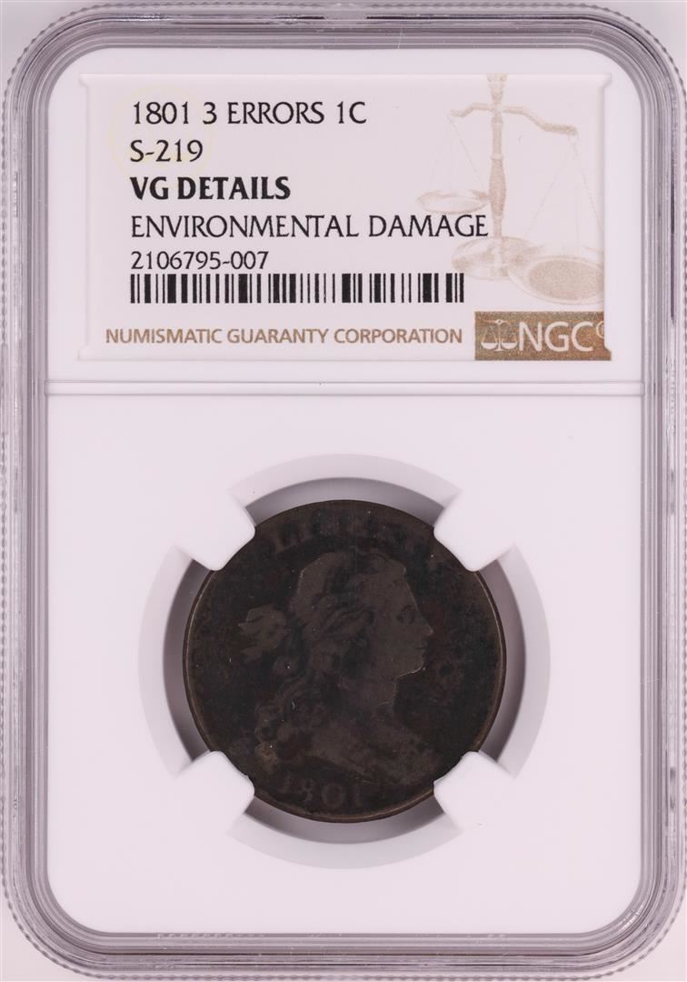 One 1801 3 Errors S-219 Draped Bust Large Cent Coin NGC VG Details. NGC Certified.
