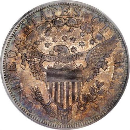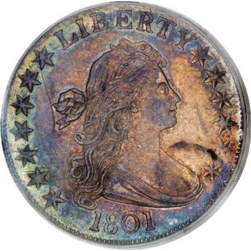 <B>1801 50C AU55 PCGS.</B></I> O-102, High R.4. The second A in STATES touches the wing feathers on this, one of only two varieties of the 1801 half dollar. When half dollar coinage resumed in 1801 (for the first time since the fabulously rare 1796-97 coinage), the total production was only 30,289 coins for the year, using a single obverse combined with two different reverses. This wonderful Choice AU specimen boasts much luster remaining under a fairly deep layer of pinkish-gold, plum, and jade-green patina. Die clashing has produced a "collar" along Liberty's upper bustline (as also seen on the BB-196 1800 silver dollars), along with a large apparent "goiter" at her throat. A marvelous early half dollar, free of apparent defects and full of appeal.<BR><BR><B>Coin Engraver:</B> Robert Scot<BR><BR><b>Shipping:</b> Coins & Currency (<a target="_blank" href="http://www.heritageauctions.com/common/shipping.php">view shipping information</a>)