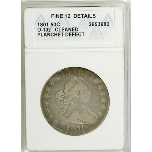<B>1801 50C --Cleaned, Planchet Defect--ANACS. Fine 12 Details.</B></I> O-102. NGC Census: (14/177). PCGS Population (13/137). Mintage: 30,289. Numismedia Wsl. Price: $1,875. (#6064)<BR><BR><b>Shipping:</b> Coins & Currency (<a target="_blank" href="http://www.heritageauctions.com/common/shipping.php">view shipping information</a>)