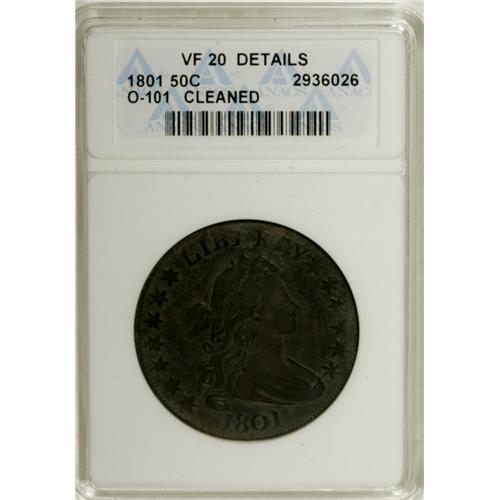 <B>1801 50C --Cleaned--ANACS. VF20 Details.</B></I> O-101, R.3. Deep ebony-brown toning conceals a past cleaning, which is relatively mild for the grade and type. All letters in E PLURIBUS UNUM are at least partly visible.<BR><BR><b>Shipping:</b> Coins & Currency (<a target="_blank" href="http://www.heritageauctions.com/common/shipping.php">view shipping information</a>)