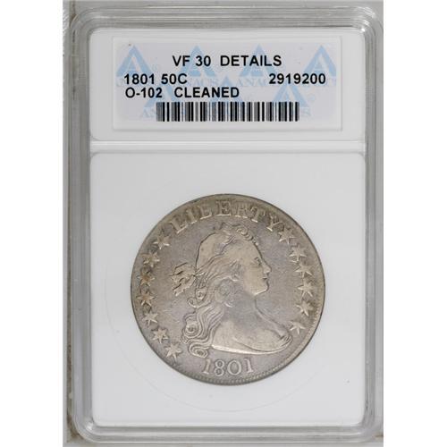 <B>1801 50C --Cleaned--ANACS. VF30 Details.</B></I> O-102, High R.4. A strangely bright gray-brown example that has moderate wear. The usual handling marks are present in the fields.<BR><BR><b>Shipping:</b> Coin/Currency (<a target="_blank" href="http://www.heritageauctions.com/common/shipping.php">view shipping information</a>)