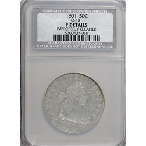 <B>1801 50C --Improperly Cleaned--NCS. F Details.</B></I> O-101. NGC Census: (5/91). PCGS Population (17/147). Mintage: 30,289. Numismedia Wsl. Price for NGC/PCGS coin in F12: $2,050. (#6064)<BR><BR><B>Coin Engraver:</B> Robert Scot<BR><BR><b>Shipping:</b> Coins & Currency (<a target="_blank" href="http://www.heritageauctions.com/common/shipping.php">view shipping information</a>)