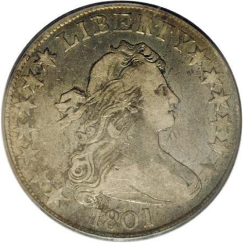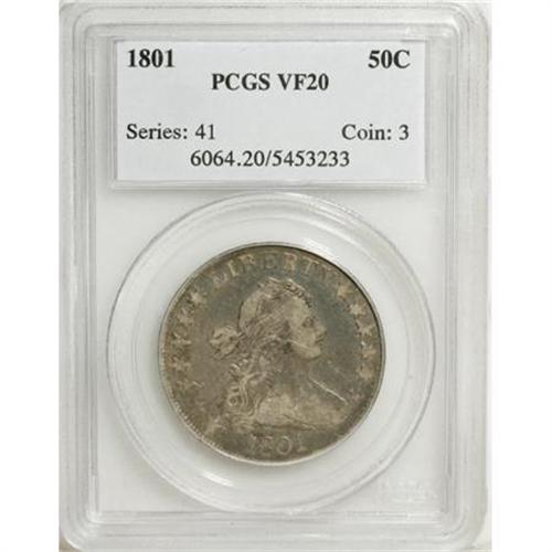 <B>1801 50C VF20 PCGS.</B></I> O-101, R.3. Numerous reverse die defect lumps identify this variety, including one between ER of AMERICA, and a couple of others near the arrow points. Golden-gray and sky-blue patination occupies both sides of this generally well defined half dollar. A few minor circulation marks are visible on each side.<BR><BR><B>Coin Engraver:</B> Robert Scot<BR><BR><b>Shipping:</b> Coins & Currency (<a target="_blank" href="http://www.heritageauctions.com/common/shipping.php">view shipping information</a>\)