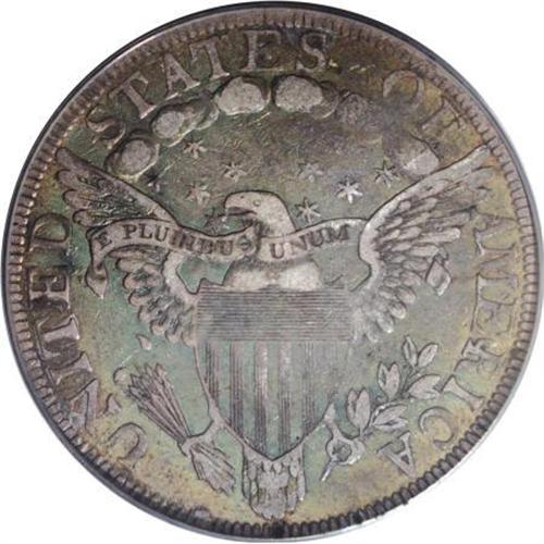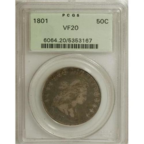 <B>1801 50C VF20 PCGS.</B></I> O-101, R.3. Attributed by a large close date, the first A of AMERICA not quite touching the wing feathers, and die defect lumps near the arrowheads. Lovely olive and golden-rose toning is seen in the fields with lavender accents over the highpoints. There is an obvious spot on Liberty's cheek and a short nick in the field below Liberty's chin.<BR><I></B></I><BR><BR><B>Coin Engraver:</B> Robert Scot<BR><BR><b>Shipping:</b> Coins & Currency (<a target="_blank" href="http://www.heritageauctions.com/common/shipping.php">view shipping information</a>\)