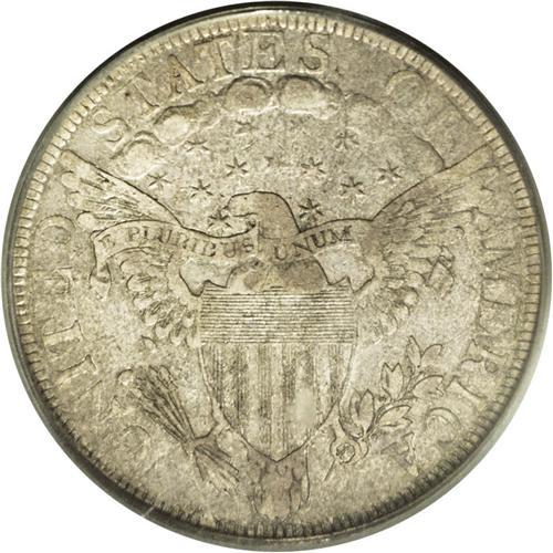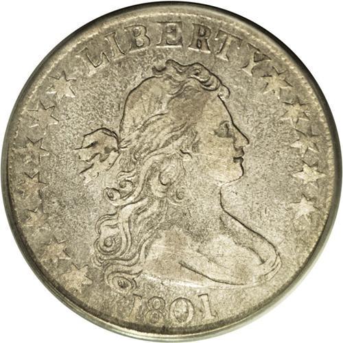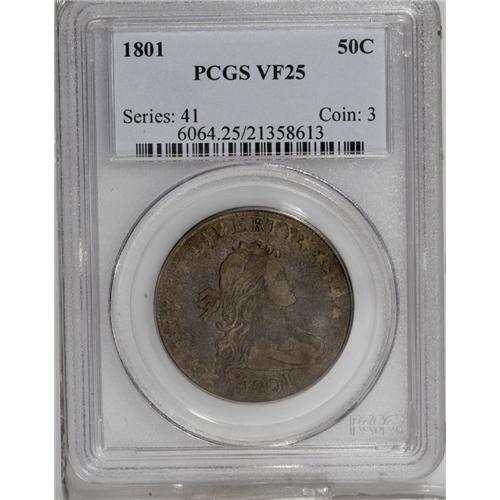 <B>1801<50C> VF25 PCGS.</B></I> O-101, R.3. Several small die breaks on the lower left reverse help identify this Overton marriage; one of only two known for this elusive date. This surprisingly sharp representative displays a fully legible E PLURIBUS UNUM, and each shield line is distinctive. The deep gray surfaces display numerous wispy blemishes, none of which are worthy of further discussion.