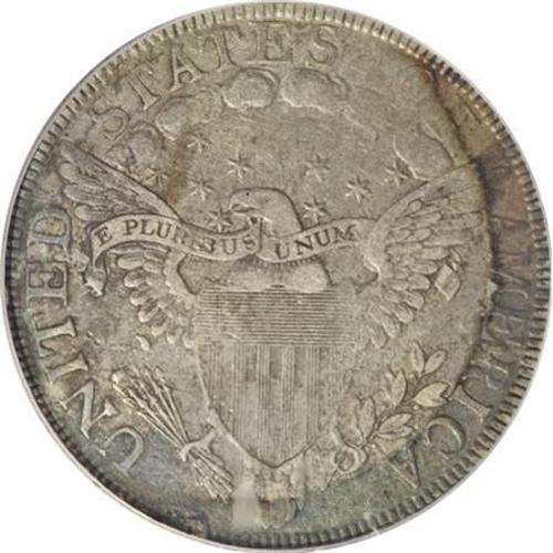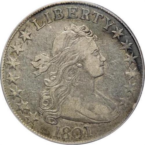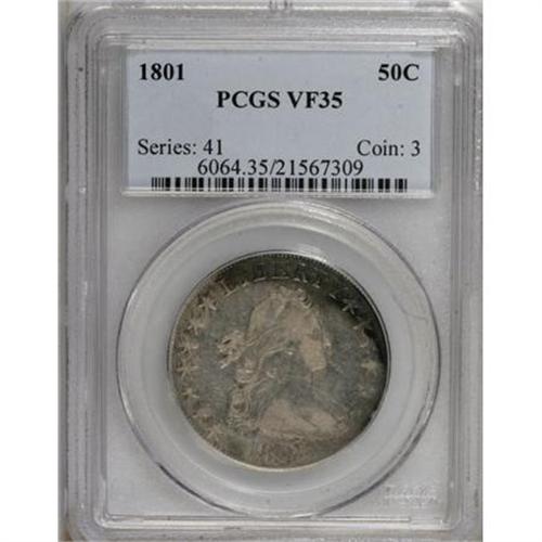 <B>1801 50C VF35 PCGS.</B></I> O-101, R.3. Quickly identified by the die lumps near the arrowheads, Overton-101 is one of only two die marriages (both sharing the same obverse) for this premier Heraldic Eagle half dollar date. Just 30,289 pieces were struck, and survivors above low-end VF are a significant find for the early half specialist. Predominantly light silver-gray with arcs of much deeper charcoal and tobacco-brown toning that wrap around each side. Population: 19 in 35, 42 finer (9/07).<BR><BR><B>Coin Engraver:</B> Robert Scot<BR><BR><b>Shipping:</b> Coins & Currency (<a target="_blank" href="http://www.heritageauctions.com/common/shipping.php">view shipping information</a>)