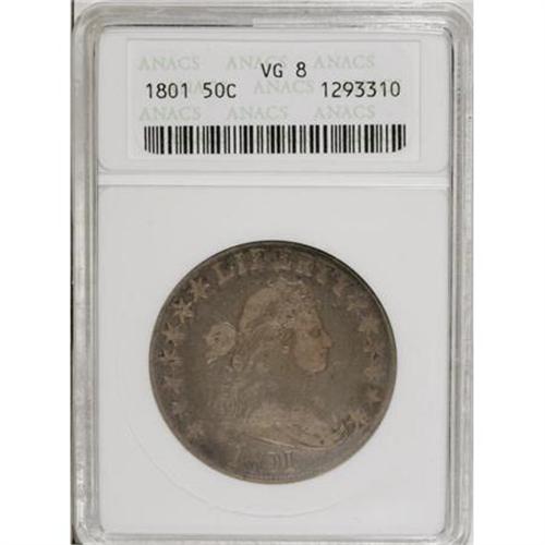 <B>1801 50C VG8 ANACS.</B></I> O-102, High R.4. Encountered far less often than O-101, the other known variety of this very popular date. In terms of detail, the current piece seems to call to a higher grade. An original coin that is housed in an older generation ANACS holder.<BR><BR><B>Coin Engraver:</B> Robert Scot<BR><BR><b>Shipping:</b> Coins & Currency (<a target="_blank" href="http://www.heritageauctions.com/common/shipping.php">view shipping information</a>)