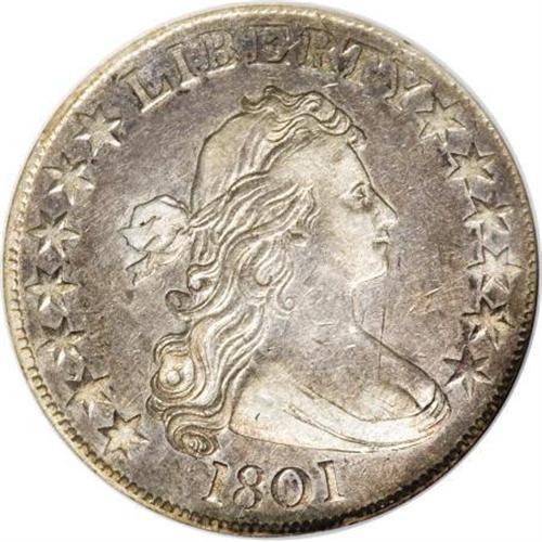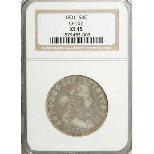 <B>1801 50C XF45 NGC.</B></I> O-102, High R.4. Slightly scarcer in all grades than the O-101, the 102 is also significantly more challenging in high grades. Apparently none are known above the AU50 level, which is quite different from the O-101 where several AU or Mint State examples are known. This variety differs from O-101 by the presence of only 12 arrows on the reverse and the left base of A2 embedded in the wing feathers.<BR> Both dies are perfect on this example, apparently as always. Unlike some, star 12 is sharp on this piece, perhaps alluding to an earlier die state.<BR>Pewter-gray surfaces exhibit faint traces of lime, gold, and iridescent toning at the borders with some luster still present on the reverse. Both sides have a few minuscule scratches and contact marks that are the rule rather than the exception on these early coins.<BR> This piece falls in the middle of the Condition Census, perhaps third or fourth finest, as there are multiple XF45 coins known. Its overall eye appeal and quality places it among the finest of the several XF45 coins known. <BR> Haseltine-2; Beistle 1-B; Overton-2; PCGS# 6064, 39268; Encyclopedia-4568.<BR><I>Ex: Lano Balulescu (11/1999).<BR>From The Westmoreland County Collection of Early Bust Halves, 1794-1807.</B></I><BR><BR><B>Coin Engraver:</B> Robert Scot<BR><BR><b>Shipping:</b> Coins & Currency (<a target="_blank" href="http://www.heritageauctions.com/common/shipping.php">view shipping information</a>)