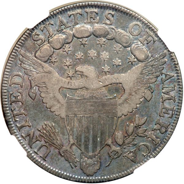 1801 Draped Bust Dollar. NGC graded VF-25. Original dark toning on both sides with normal wear on the hair curls, drapery over the shoulder, and on the eagle and shield. Uncleaned, original specimens like this get the nod from most collectors over the usual dipped or cleaned appearance of many pieces floating around.