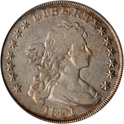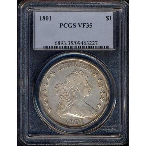 <b>1801 Draped Bust Dollar. PCGS graded VF35.</b> A few light marks on the portrait and in the fields, but generally careful in terms of preservation with light gray to russet brown toning. The rims are choice <b>(PCGS # 6893)</b>