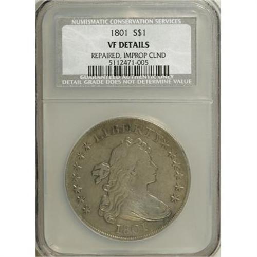 <B>1801 $1--Repaired, Improperly Cleaned--NCS. VF Details.</B></I> B-2, BB-212, R.3. Die State II with double "collar" clashmark above the cleavage. The obverse field is extensively smoothed, and the surfaces are whizzed, hairlined, and glossy. Nonetheless, this pale green-gold piece is sharply defined, particularly on the heraldic eagle.<BR><BR><B>Coin Engraver:</B> Robert Scot<BR><BR><b>Shipping:</b> Coins & Currency (<a target="_blank" href="http://www.heritageauctions.com/common/shipping.php">view shipping information</a>)
