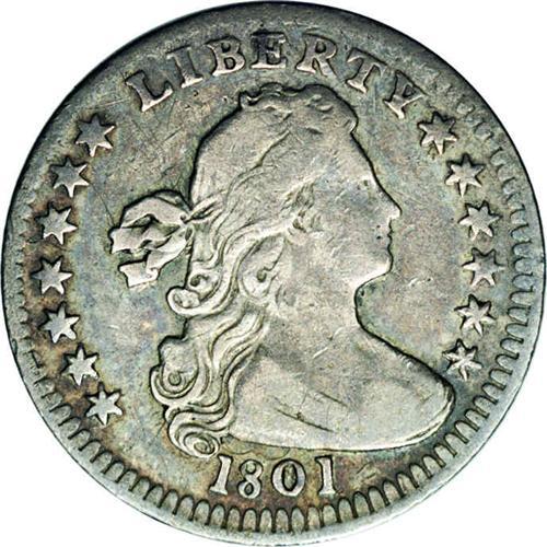 <B>1801<H10C> V-1, and V-2, LM-2, R.4. Reiver state a. AG3 NGC.</B></I> A very nice coin for the grade with medium steel-gray and a sharp strike on most of the devices. The obverse is nearly a grade higher, with just a few stars and the tops of LIB worn into the rim, the reverse has more wear and many letters are worn into the rim, and much of AMERICA has worn smooth. A very early die state struck before the obverse die clashed above the date or Liberty's head. Rare and desirable despite the moderate grade. Identifiable by a minor nick near the center of the shield.<BR><I> No pedigree information included.</B></I> Envelope Included.
