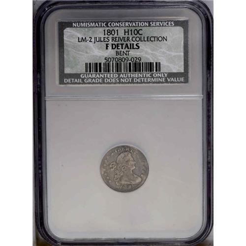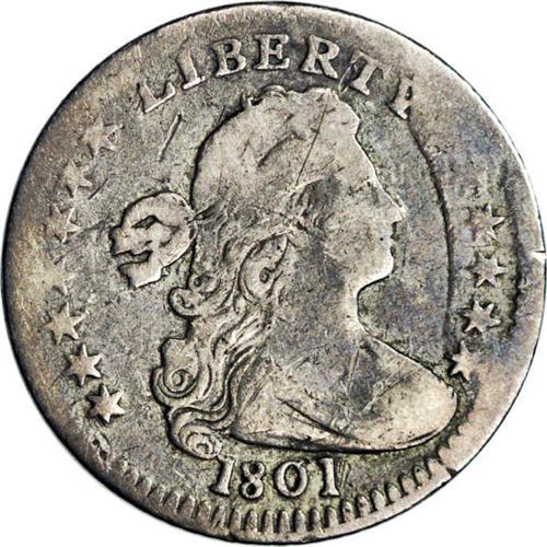 <B>1801<H10C> V-1 and V-2, LM-2, R.4. Reiver state d.--Bent--NCS. Fine Details.</B></I> This coin is apparently bent with telltale uneven wear along the rims with stars and lettering worn into the dentils. The strike is average with minor weakness on the reverse above the eagle's head in the star field and clouds, and on his lower right wing and shield. Attractive medium gray with a few trivial nicks and scratches expected for the grade.<BR><I> No pedigree information included.</B></I> Envelope Included.