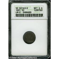<B>1801<H10C>--Damaged--ANACS. VG Details, Net Good 6.</B></I> V-1, LM-2, R.4. Electric-blue and reddish-crimson surfaces reveal several short scratches over each side, a few minute punches in the right obverse field, and some light porosity on the reverse. The obverse design elements are nicely detailed for the grade. <BR><BR><B>Important notice:</B> Heritage usually auctions material at the rate of 200-250 lots per hour. On some occasions eBay Live bid software or the Internet may not be able to keep up with the pace of the auction. We recommend placing a realistic absentee bid now as insurance to avoid disappointment. Occasionally the auctioneer may eliminate or reject an eBay Live bid, and the auctioneer may also reopen a lot after the close of the eBay live bidding (usually because we missed an audience bid), and may reject your bid even if it shows you as the winning bidder. By bidding via eBay Live, you agree that Heritage may award the lot to another bidder at its sole discretion under the circumstances described above or any other reasonable circumstances. Since eBay bids are not shown to us until we open the lot on the floor, we treat those bids just like floor bids. In most cases the floor responds before the eBay bid is presented to us, due to Internet lag time, so for consistency we have made it a policy that floor bids are always considered first over tie eBay live bids. Also please note that all Heritage lots purchased through eBay Live carry a 20% Buyer's Premium. Please make sure you read the Terms and Conditions before you bid.