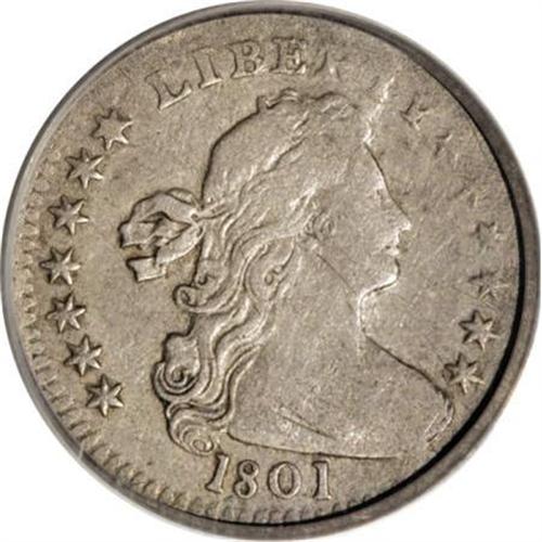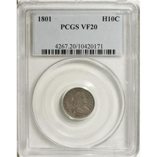 <B>1801 H10C VF20 PCGS.</B></I> V-1 and V-2, LM-2, R.4. 1801 is a rare date with only two known die varieties. Since LM-1 is non-collectible, date and <I>Guide Book</B></I> variety collectors must choose examples of LM-2. This cream-gray example is unabraded and shows pleasing detail across portions of the major devices. The strike is typical on AMERICA and the final S in STATES. Population: 3 in 20, 23 finer (8/07).<BR><I>From The Beau Clerc Collection.</B></I><BR><BR><B>Coin Engraver:</B> Robert Scot<BR><BR><b>Shipping:</b> Coins & Currency (<a target="_blank" href="http://www.heritageauctions.com/common/shipping.php">view shipping information</a>)