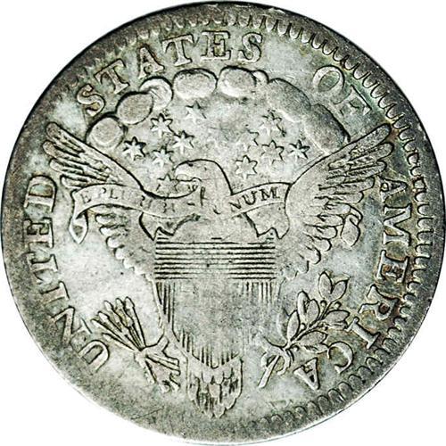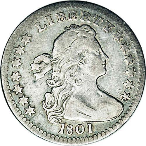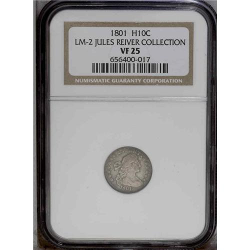 <B>1801<H10C> V-1 and 2, LM-2, R.4. Reiver state b. VF25 NGC.</B></I> Light silvery-gray with traces of peripheral russet and blue. Attractive for the grade, with the strike generally even and the surfaces revealing no problems. There is minor striking weakness on the lower portion of the shield.<BR> On this die state, both the obverse and reverse dies show strong evidence of clashing in the fields and over the date, and there is a faint die crack from the rim to the Y of LIBERTY, down the inside points of stars eight through eleven where the crack turns out to the rim through the upper points of star twelve. The die clashing is noted over the date from the clouds, and in the right obverse field where the eagle's wing and branch are present. On the reverse the die clashing consists of the outline of Liberty's bust and we suspect that clashing from her head weakened the shield.<BR><I>No pedigree information included.</B></I> Envelope Included.